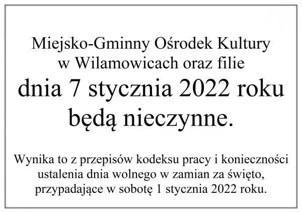 - w dniu 7 stycznia 2022 r. (piątek) Urząd Gminy w Wilamowicach będzie nieczynny.