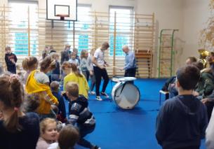 Wielkie zaciekawienie wzbudziła prezentacja instrumentów muzycznych: ich nazwa, rodzaj i brzmienie. A kiedy dzieci zostały zaproszone na scenę, by zagrać na perkusji, niemal każdy chciał spróbować swoich sił i nie zrażał się ogromna kolejką do pałeczek.