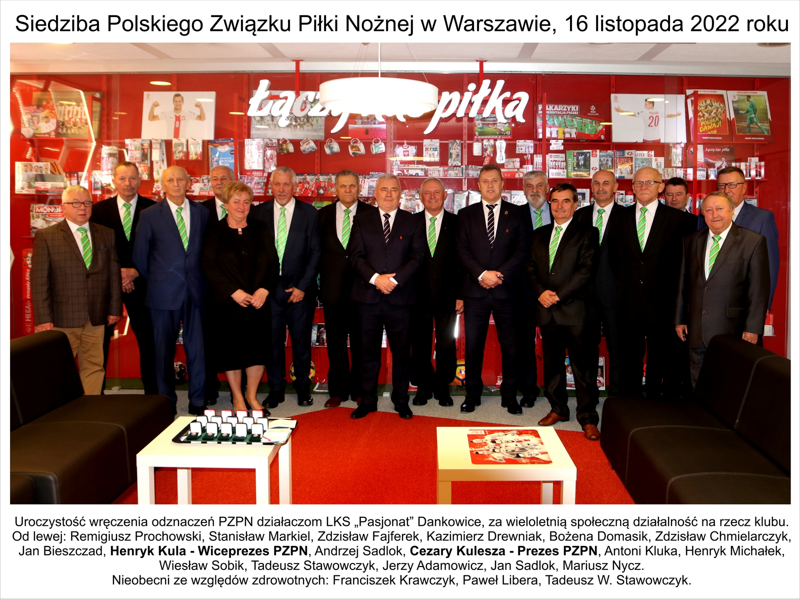 16 listopada 2022 r. w siedzibie Polskiego Związku Piłki Nożnej w Warszawie miało miejsce szczególne wydarzenie. 15 osobowa grupa działaczy Ludowego Klubu Sportowego PASJONAT Dankowice (powiat bielski) spotkała się z Prezesem Polskiego Związku Piłki Nożnej, Panem Cezarym Kuleszą, Wiceprezesem PZPN Panem Henrykiem Kulą oraz Zastępcą Sekretarza Generalnego PZPN Panem Markiem Łukiewskim.