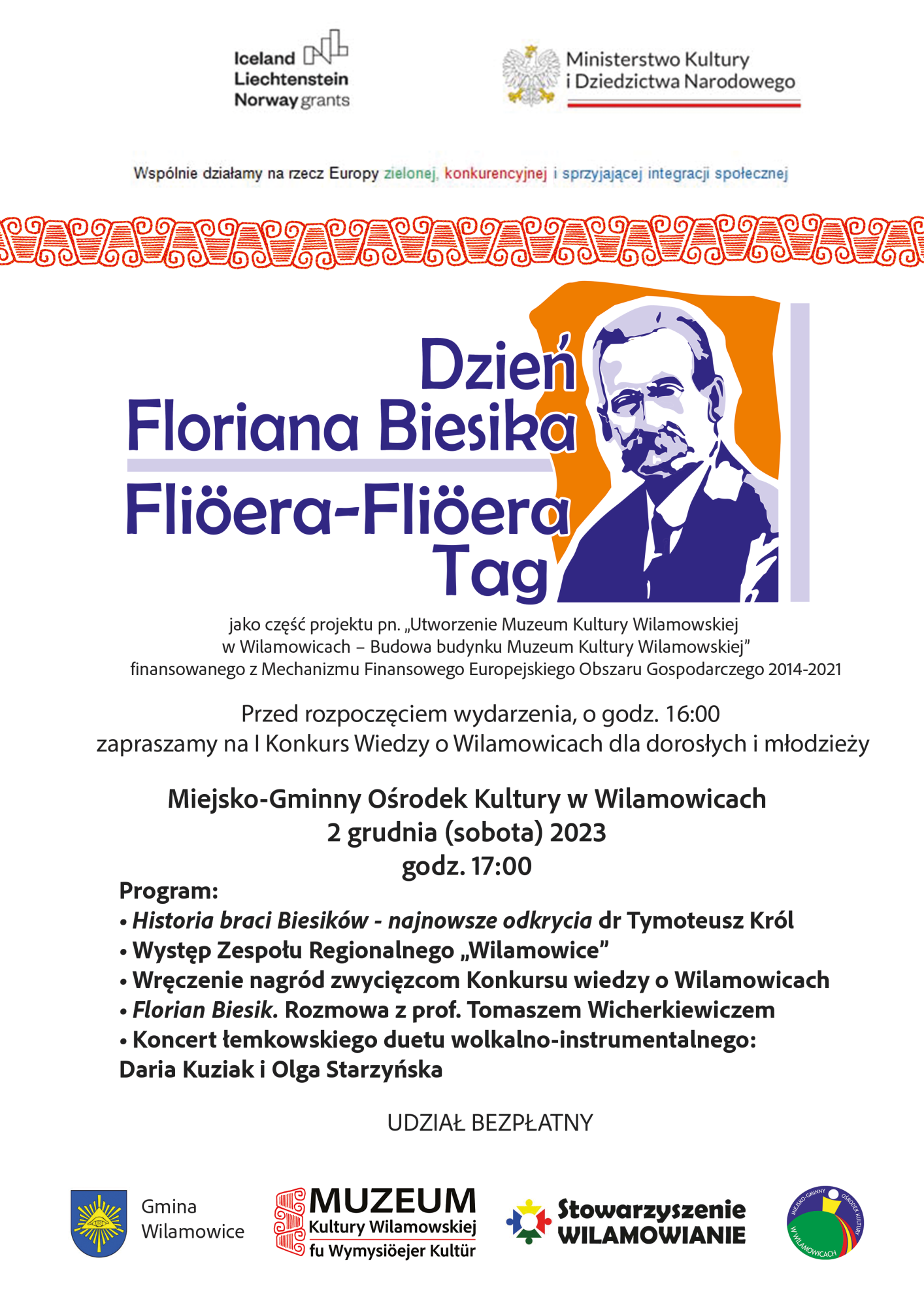 Przed rozpoczęciem wydarzenia, o godz. 16:00 zapraszamy na I Konkurs Wiedzy o Wilamowicach dla dorosłych i młodzieży