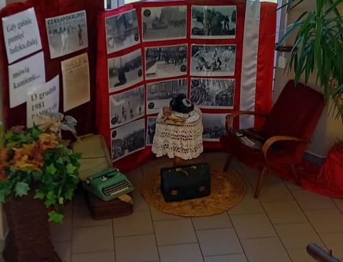 Zorganizowaliśmy również wystawę pamiątek pod tytułem „40 lat po stanie wojennym”. Na korytarzu szkoły zagościł kącik patriotyczno- historyczny.Mogliśmy przenieść się do 1981 roku oglądając mały gabinet, jakby przed momentem opuszczony przez działacza Solidarności.Przedmioty z epoki, kartki na żywność, dokumenty i przede wszystkim zdjęcia pomogły nam odczuć atmosferę tamtych lat. Cieszymy się,że nasza wystawa stała się żywym obiektem zainteresowania uczniów naszej szkoły.