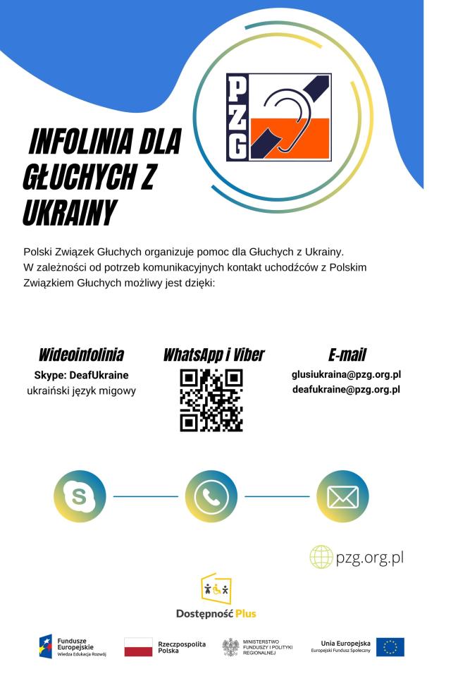 Polski Związek Głuchych uruchomił na zlecenie MFiPR wideoinfolinię, która znosi barierę w komunikowaniu się z osobami głuchymi z Ukrainy i jest pomocna przy wsparciu i świadczeniu pomocy tym osobom. Zwracamy się z prośbą o upowszechnienie informacji o videoinfolinii do wszystkich potencjalnie zainteresowanych skorzystaniem z usługi. Przekazujemy w załączeniu ulotki informacyjne pomocne przy działaniach promocyjnych.