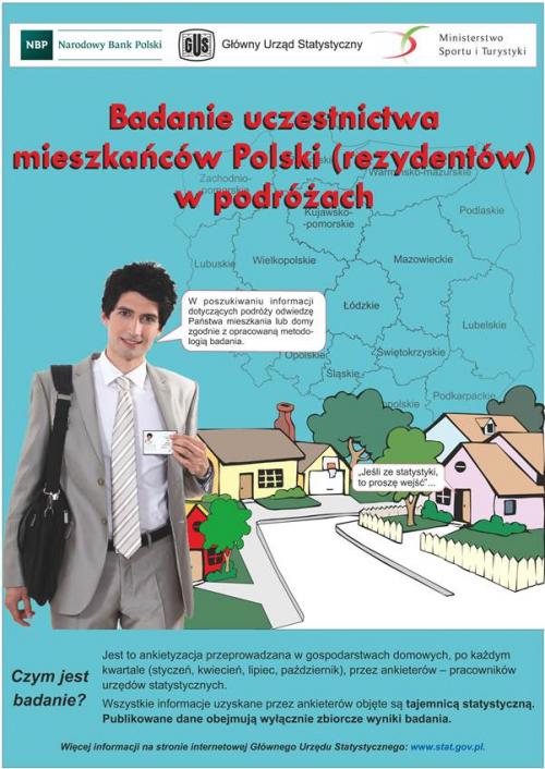 Nawiązując do przesyłanych w ubiegłym roku informacji zapowiadających rozpoczynające się na terenie województwa śląskiego badania ankietowe realizowane przez ankieterów Urzędu Statystycznego w Katowicach, uprzejmie informujemy, że w dniach od 2 do 20 stycznia 2018 r. na terenie całego kraju zostanie przeprowadzone badanie reprezentacyjne dotyczące uczestnictwa mieszkańców Polski w podróżach pn. „Badanie uczestnictwa mieszkańców Polski (rezydentów) w podróżach”.