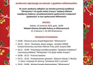 serdecznie zapraszamy na wieczór z językiem wilamowskim, w czasie którego odbędzie się promocja publikacji "Mniejszości i ich języki wobec kryzysu", w której została ujęta również sytuacja Wilamowic,