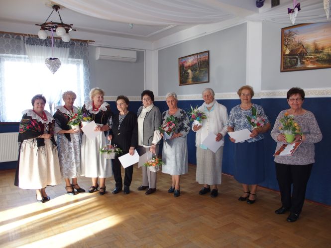 Następnie wrócono myślami wypełnionymi historią do współczesności. Wrócono na salę. Na spotkaniu było bardzo wiosennie nie tylko od dekoracji, ale od atmosfery panującej na Sali. Były wiązanki kwiatów złożone na ręce pani przewodniczącej, słodkości dla pań od naszego sympatyka Koła pana Adama Fabia, słodkości od jubilatek i śpiewu 100-tu lat dla dziewięć koleżanek, które to obchodziły swoje urodziny. W tym roku wszystkie Jubilatki otrzymały bukiety kwiatów wykonane z nylonowych rajstop przez członkinię Koła p. Marię Carbol. Oczywiście był też występ zespołu „Pisarzowianki” i pyszny posiłek przygotowany przez gospodarzy państwo Ilonę i Stanisława Pudełko.
