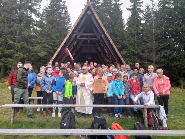 Następnie udaliśmy się do schroniska PTTK im. Kazimierza Sosnowskiego na Hali Krupowej, gdzie odbył się zasłużony odpoczynek, ognisko z pieczeniem kiełbasek i pełne humoru rozmowy. Dla dzieci zorganizowany został konkurs wiedzy o św. Janie Pawle II . Każde dziecko otrzymało pamiątkową nagrodę .