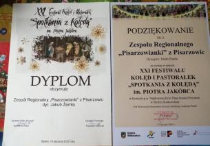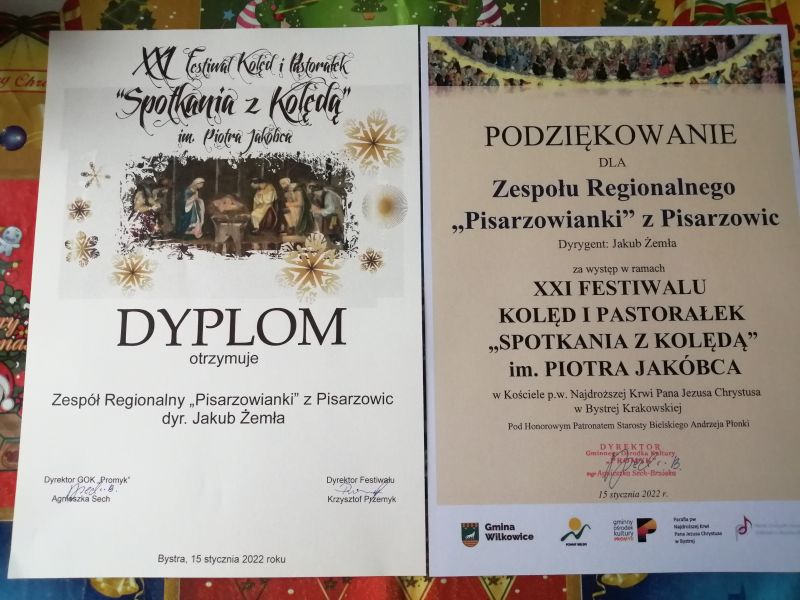 15 stycznia br. członkowie Zespołu Regionalnego „Pisarzowianki” wraz z akompaniatorem Jakubem Żemłą, wzięli udział po raz ósmy w Festiwalu. Tym razem zagościli do kościoła parafialnego pw. Najdroższej Krwi Pana Jezusa Chrystusa w Bystrej Krakowskiej. Wystąpiły również Chór z Porąbki „Zasolnica” (dyr. Barbara Gacek) i zespół ludowy z Jasienicy „Jasieniczanka” (instr. Maria Szubert). Po występach kolędnicy otrzymali wiązanki kwiatów oraz dyplomy i zostali zaproszeni przez panią Agnieszkę Sech-Brzóska, dyrektor Gminnego Ośrodka Kultury „Promyk” w Bystrej, na poczęstunek i wspólne jeszcze kolędowanie.