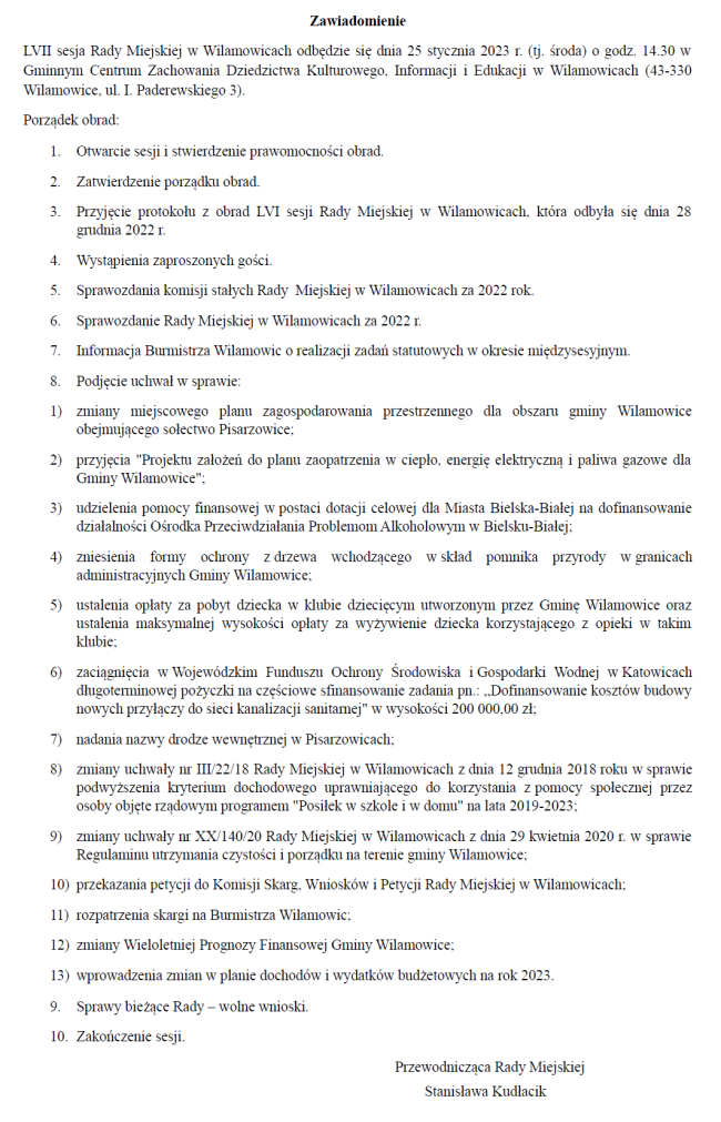 Zawiadomienie LVII sesja Rady Miejskiej w Wilamowicach