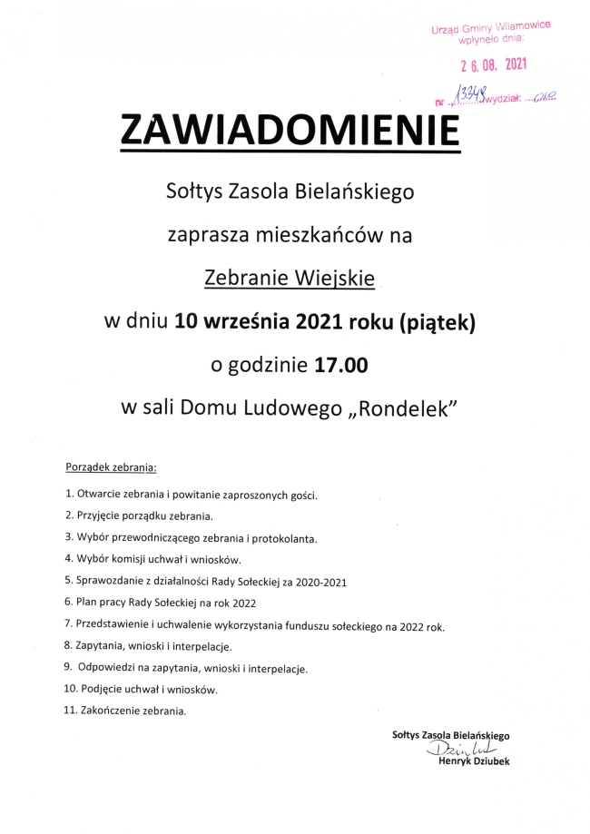 » ZAWIADOMIENIE Zebranie Wiejskie Zasole Bielańskie