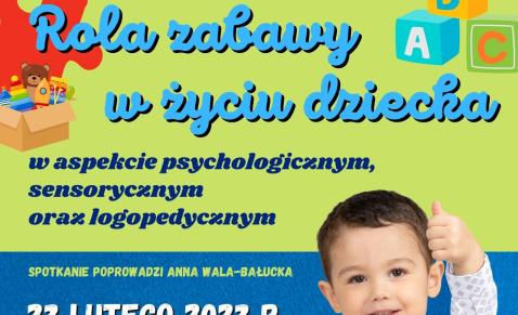 Spotkanie z terapeutą, logopedą dla rodziców dzieci w wieku przedszkolnym i wczesnoszkolnym "Rola zabawy w życiu dziecka w aspekcie psychologicznym, sensorycznym oraz logopedycznym"