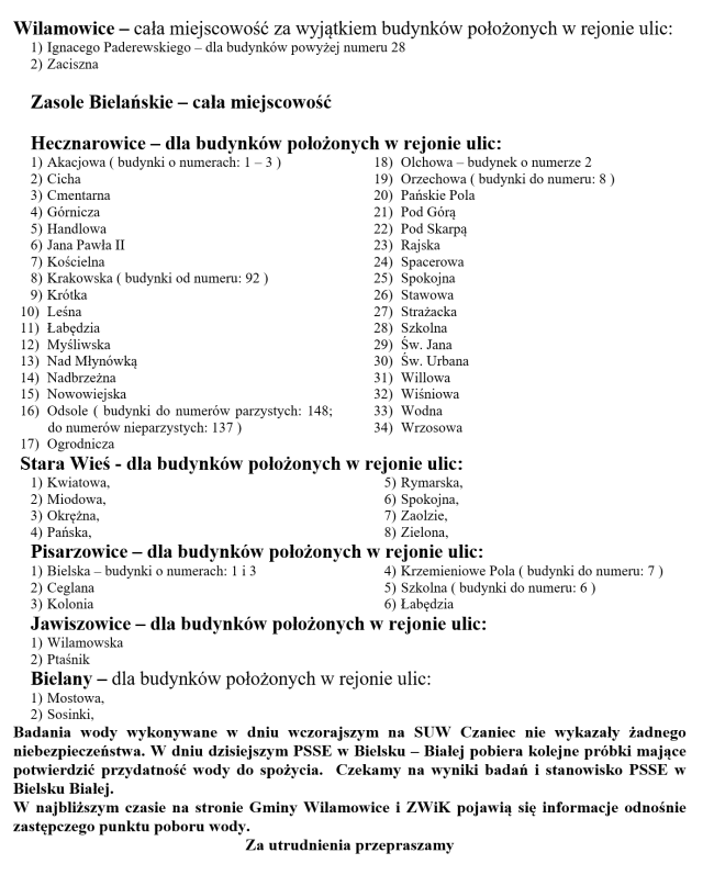 Komunikat Państwowego Powiatowego Inspektora Sanitarnego w Bielsku-Białej z dnia 19.01.2023 r. w sprawie jakości wody przeznaczonej do spożycia przez ludzi pochodzącej ze Stacji Uzdatniania Wody Czaniec mieszczącej się przy ul. Wodociągowej 1 w Kobiernicach, należącej do Górnośląskiego Przedsiębiorstwa Wodociągowego S.A. w Katowicach ul. Wojewódzka 19.